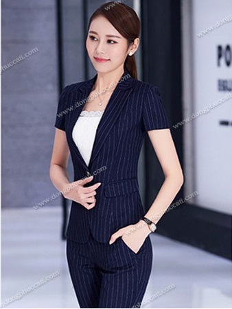 Năng động và thoải mái với mẫu vest quần nữ sọc màu xanh ngắn tay.